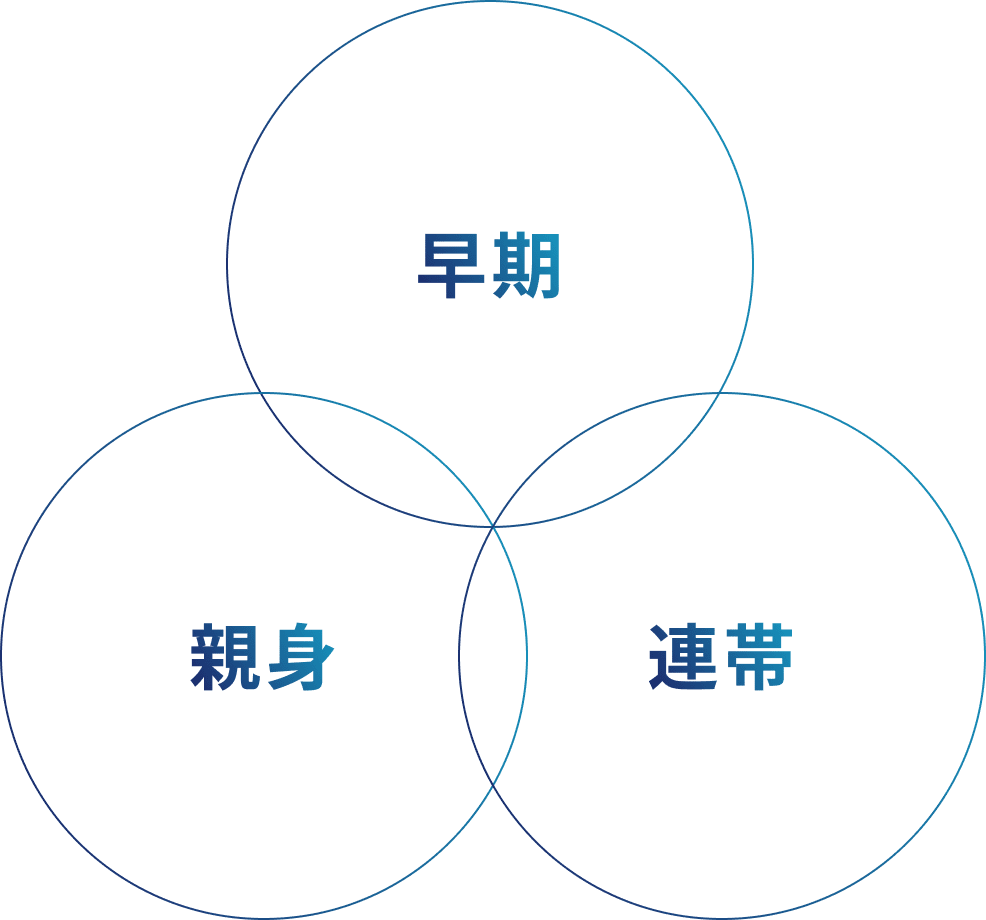 共有名義の問題や人材不足は、早急に解決したいと感じている方が多いと思います。いずれの問題も長期化することで精神的・経済的な疲弊が増していきます。私たちは、そうしたお悩みから一日でも早く解放されることを目指し、スピード対応を重視しています。年中無休でご相談を受け付けており、レスポンスの速さやお客様の状況に応じた柔軟な対応を心がけています。